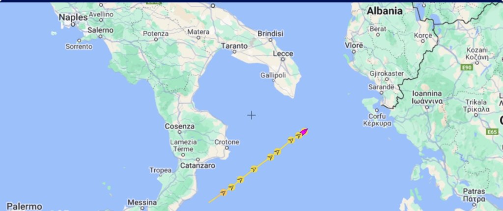 We had planned to go into Crotone on the ball of the foot of Italy, but we were due to arrive at midnight so we changed our plan again and decided to carry on to Erikoussa, a small island north of Corfu, adding approximately another 100 nm onto the journey.