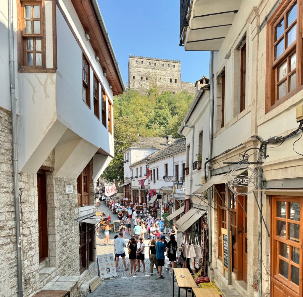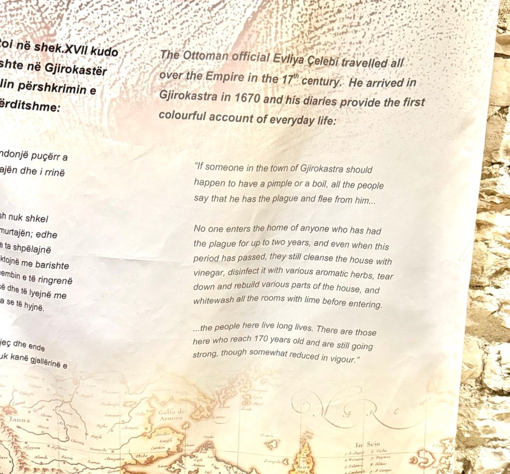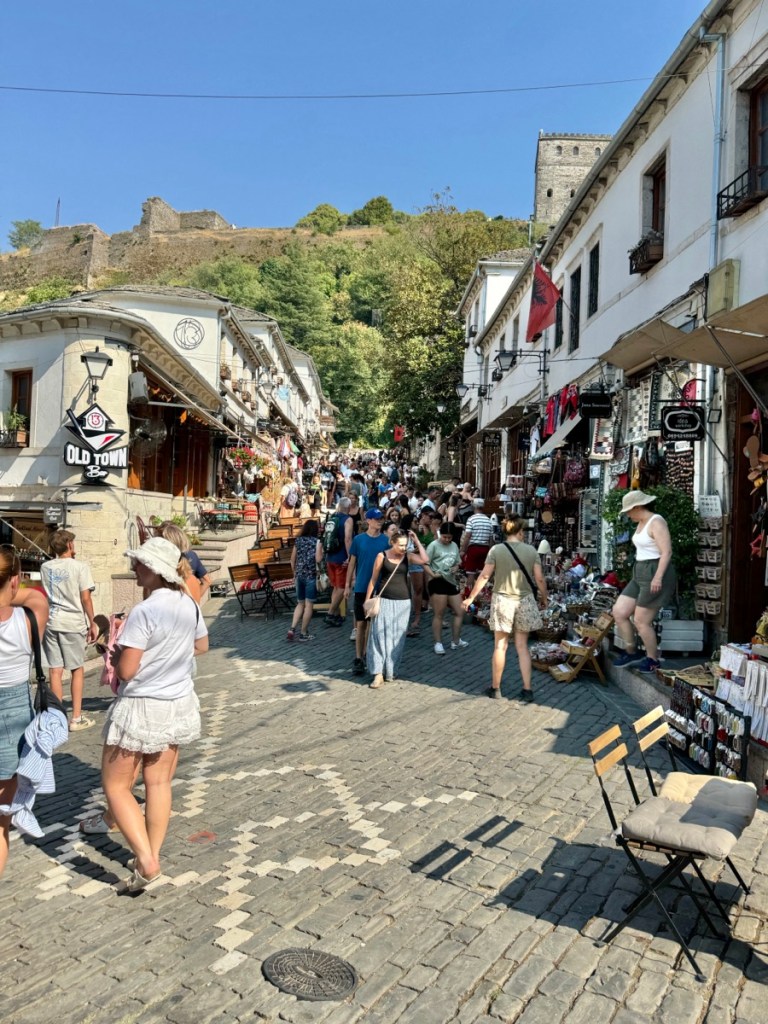 We arrived early and walked through the old town which is very pretty, it was still fairly quiet with shops just opening up. Gjirokastër is often referred to as the ‘city of stone’ because of the locally quarried limestone. The steep cobbled streets have existed for centuries but most of what is seen now dates from 1960-1980. There is recognition for a key master-builder, Simi Liukani, who began work in 1956 until his death in 1981. During years of backbreaking labour, it is estimated that he and his team laid 60,000 square meters of cobbled streets.