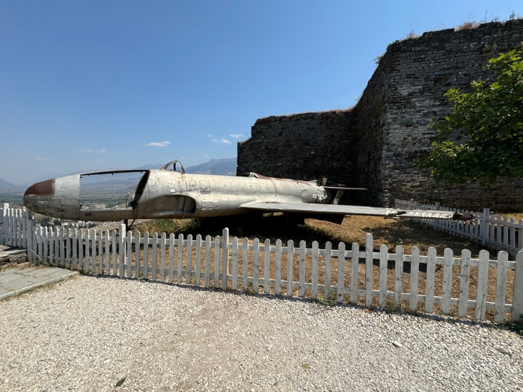 On the top of the castle there is an old U.S. military airplane on display, a Lockheed T-33 Shooting Star. In 1957 the plane landed at Tirana Airport and after the pilot returned to the U.S. the plane was left behind. In 1970 it was brought to the castle to be displayed as part of the Arms Museum. At the time there were two different versions of the story, the Americans claimed that the pilot made an emergency landing due to being low on fuel under bad weather conditions, while the Albanian version contained an interception by the Albanian army, forcing the landing of what they called a ‘spy plane’.