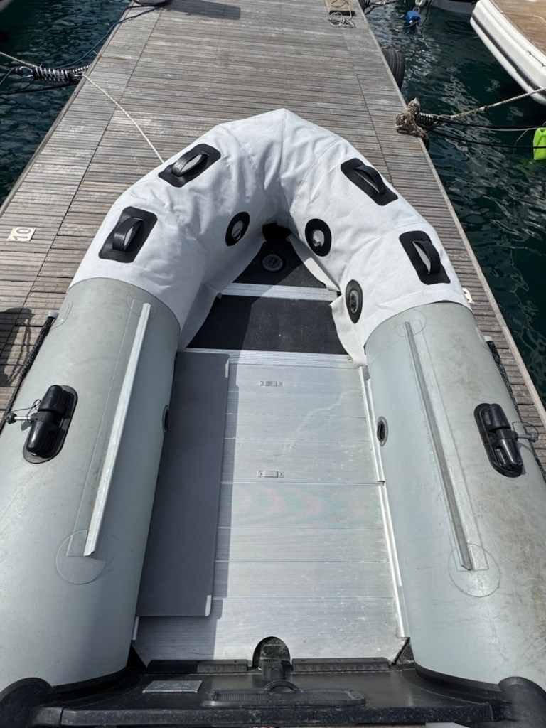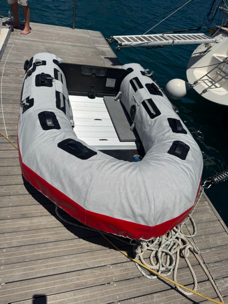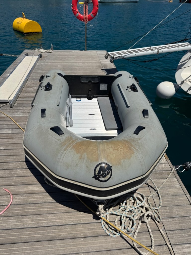 Back at the boat we waited for engineers to come and collect the pump but another week passed. It became obvious that we would be on the dock for at least another couple of weeks, so I decided to tackle a job which I have been putting off since we bought our current dinghy four years ago. We needed dinghy chaps (a cover over the topside of the sun facing tubes to protect them from harmful UV rays and chafing). Called ‘chaps’ after the Spanish word “chaparreras” which were designed to protect the legs of cowboys who rode through chaparral, a thick, thorny brush. The PVC is deteriorating and has already gone very sticky on our dinghy and it’s not nice to sit on, so in order to preserve it for hopefully another season or two I had to set to work.