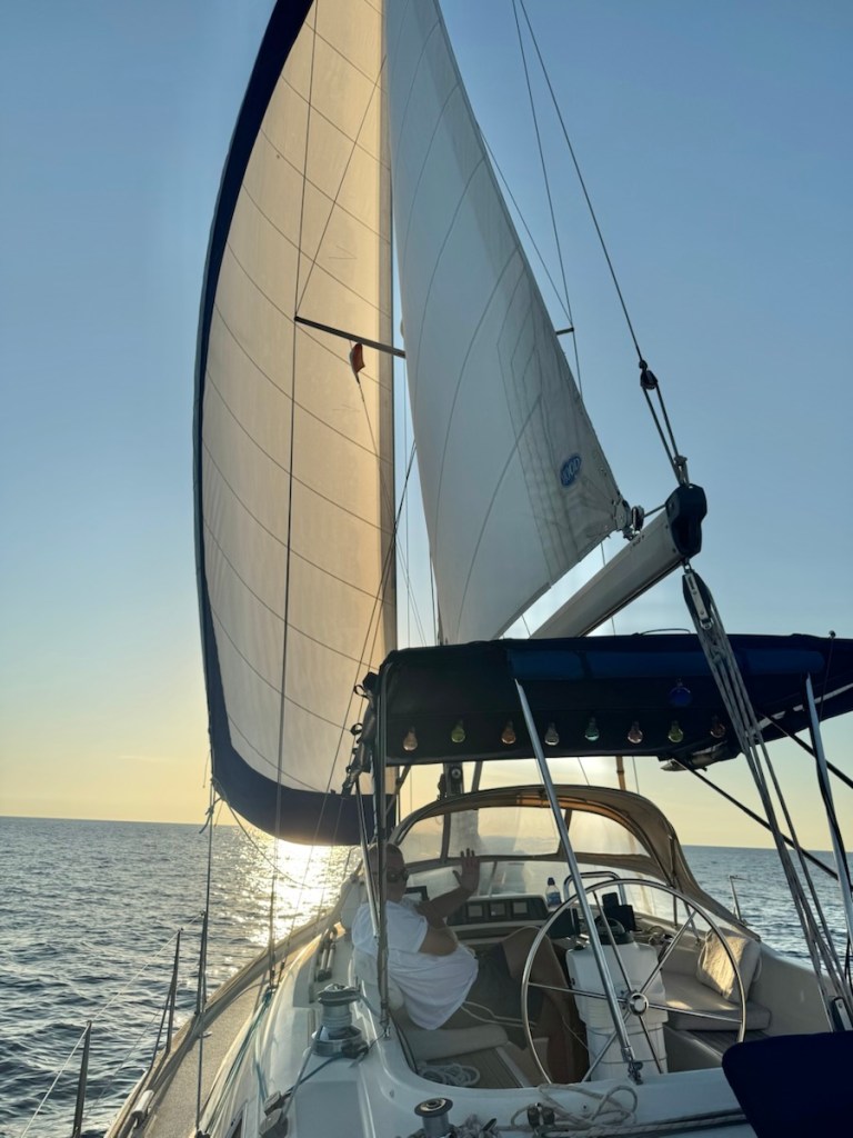This week we’ve had a week of travelling which started when we lifted the anchor at Favignana. The sun was rising and a force 3 northerly wind was blowing as we left Favignana, and headed northwest towards Capo Carbonara on the south coast of Sardinia. Once out of the bay, we had the sails up and were sailing slowly.