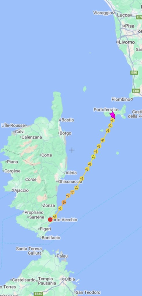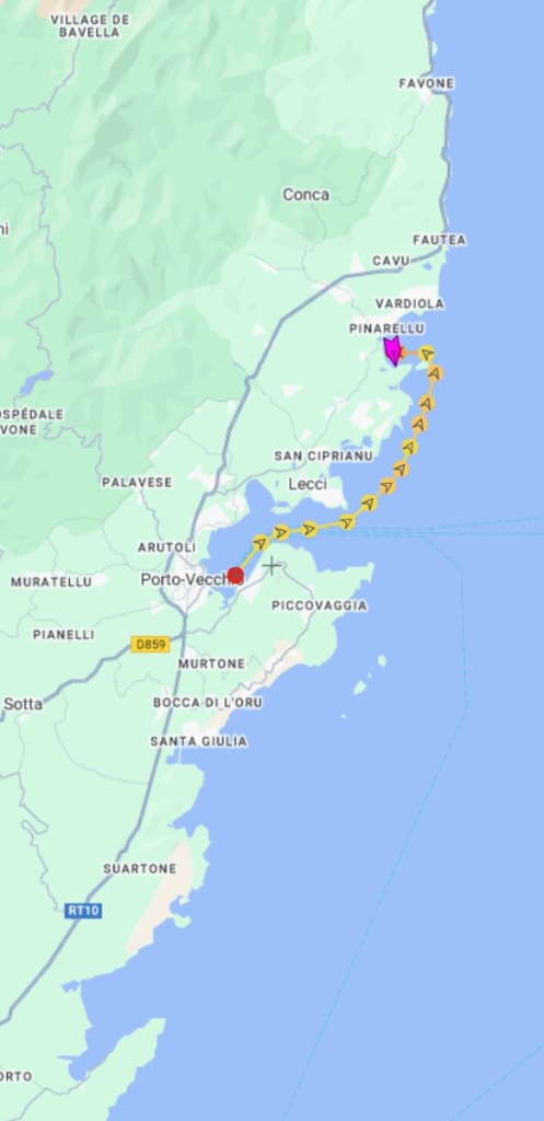 We left the bay and continued north to again try to outrun the storm. The top blue dot is Porto Vecchio and we headed towards the green dot. We arrived at Golfo de Pinarellu where the forecast was more favourable with better shelter and less wind. It was very busy in the anchorage, everyone had the same idea, but we managed to find a nice sandy area to drop the anchor in clear water.