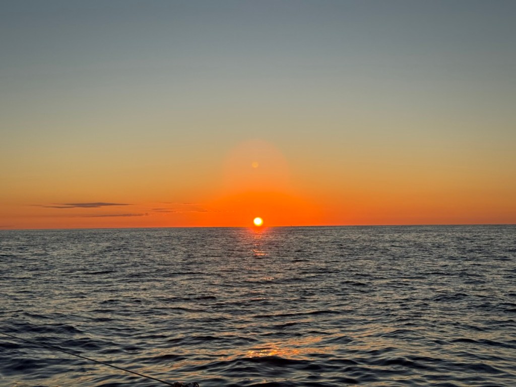 On the morning of the passage we lifted the anchor before sunrise and motored out of the bay under a starry sky. There were some storm clouds still around, but in the bay the water was dead flat calm and there was no wind or rain. As the sun rose, the wind picked up and the sails were hoisted. We managed to maintain a good speed to keep ahead of the storms which we could see developing behind us.