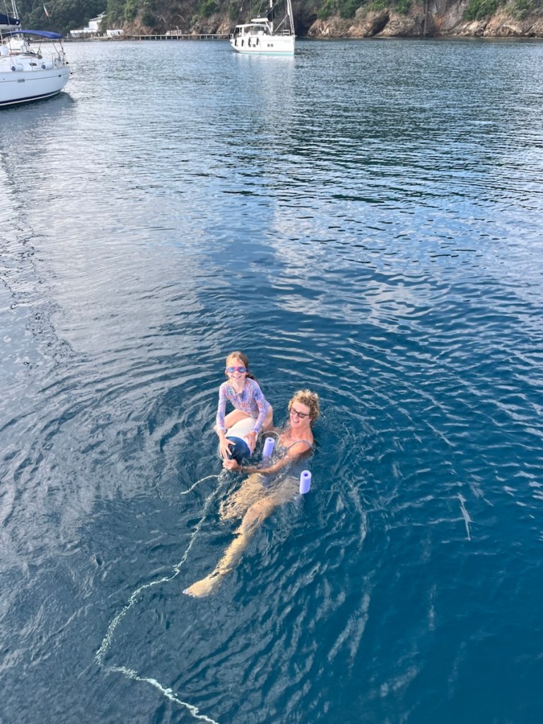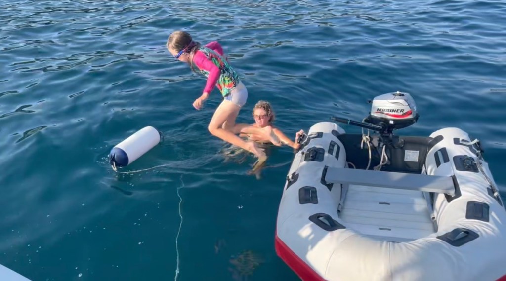 Being at anchor had the added benefit that we could swim from the boat, as confidence grew swimming in the deep water, the dinghy soon became a platform to jump from.
