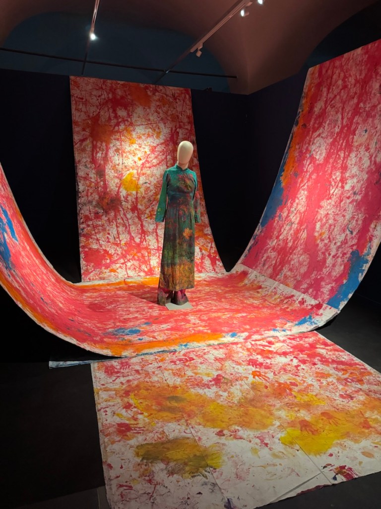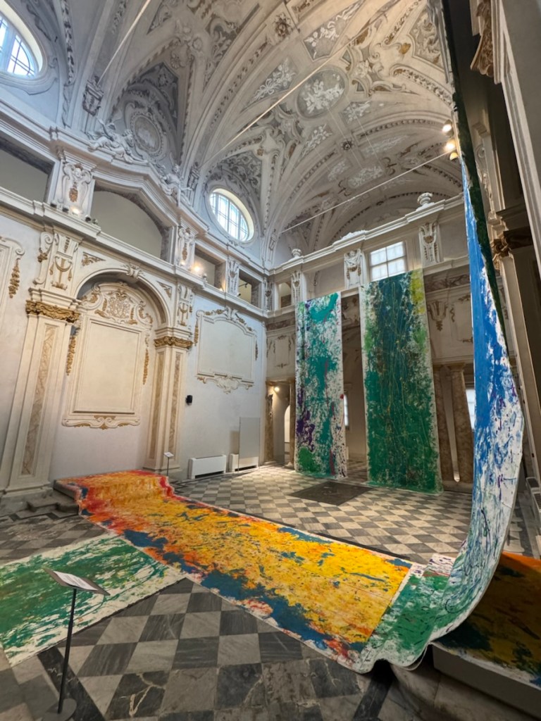 A collection of contemporary art was displayed in the rooms of a deconsecrated 18th century church, with works dating from 1945 to today. The space was dominated by the recent work of Italian artist Francesca Chiala where lengths of painted fabrics were draped from the balconies of the elaborate church room.