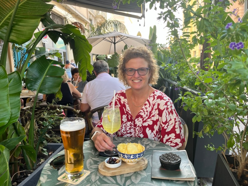 Back down the hill, we cooled off in the clear water at the beach before a walk around the smart town, with plenty of expensive ornate buildings, a casino and without the usual cheap souvenir shops. Later we enjoyed refreshments in a bar, sitting among more bushes.