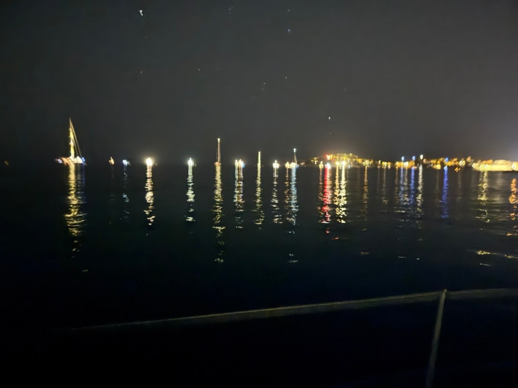 We anchored in crystal clear blue water at the bay at Beaulieu Sur Mer among super yachts, which were all very well lit up at night