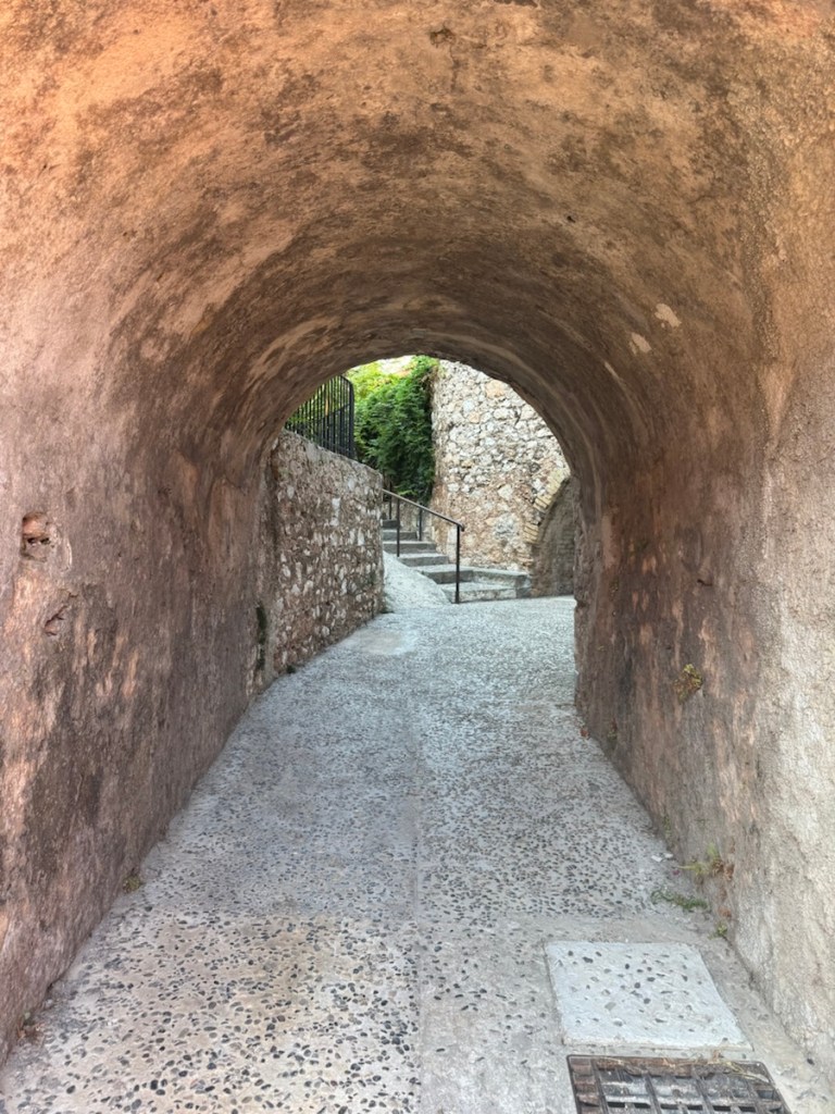 Making good use of our private dinghy harbour, we left Fred and walked up and over the hill to Villefranche Sur Mer. In contrast to Beaulieu, numerous tourists and cruise ships frequently visit the bay of Villefranche. It is set within an amphitheatre of cliffs with long beaches, turquoise water, sea front cafes and restaurants, all at the foot of the old town.