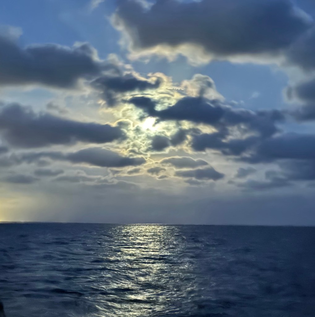 The swell built again and the wind was coming from directly in front which wasn’t the forecast. We headed south west passing the very hazy coast of Barcelona, where lots of big ships were anchored in front of the port. The wind shifted slightly, picked up, dropped off, and we had an afternoon of sails up, sails down, but progressed mainly under engine.