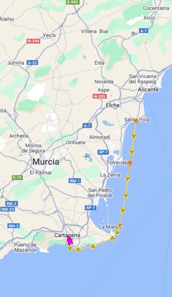 The first part of our journey was 26 nm, the wind was only force 2-3 and with a flat sea, we had a gentle sail down to Santa Pola.